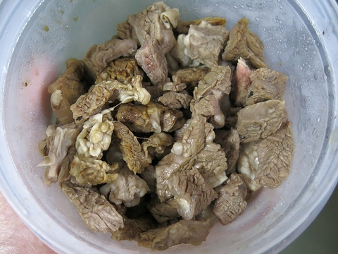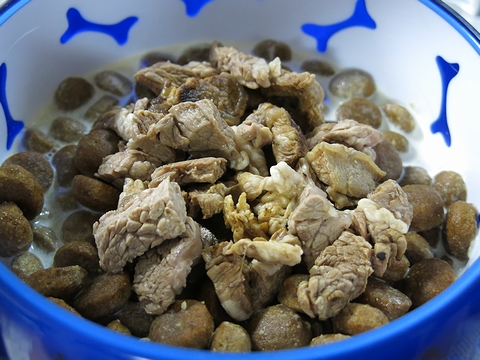 いつものフードにドッグミルクの粉をかけ、お湯を注ぎ、スペシャルな牛肉をトッピング。
